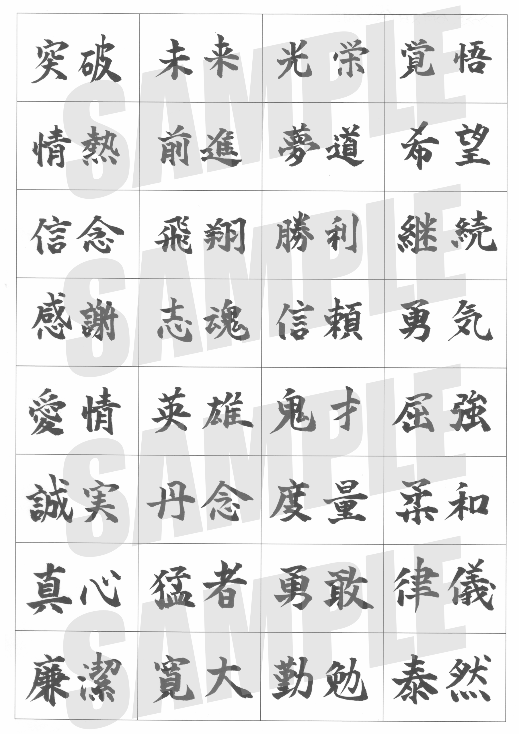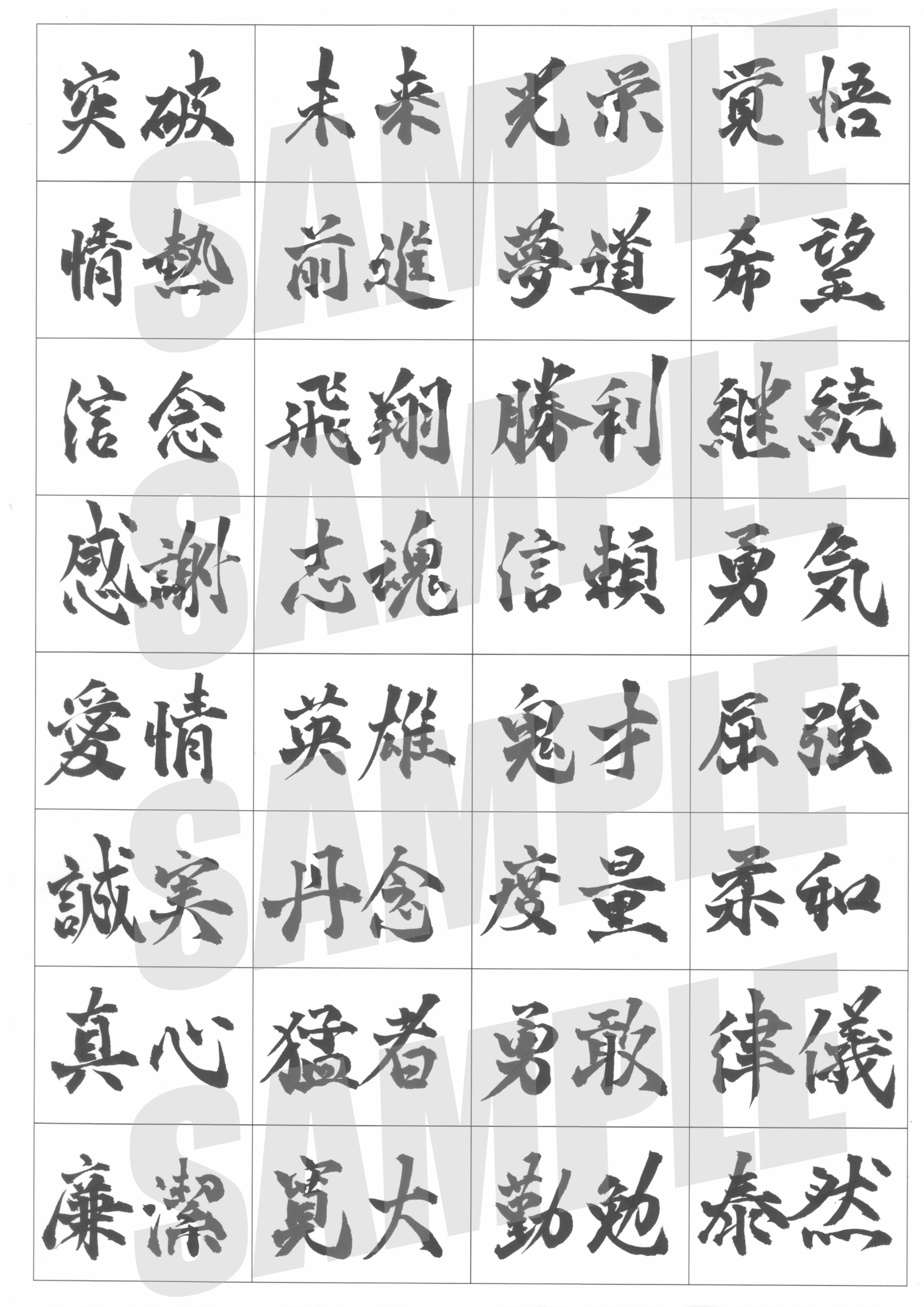 信念・飛翔・感謝・志魂・勝利・継続など、人との出会いや努力の精神を表す熟語を極細筆ペンで楷書体として書いた作品群です。