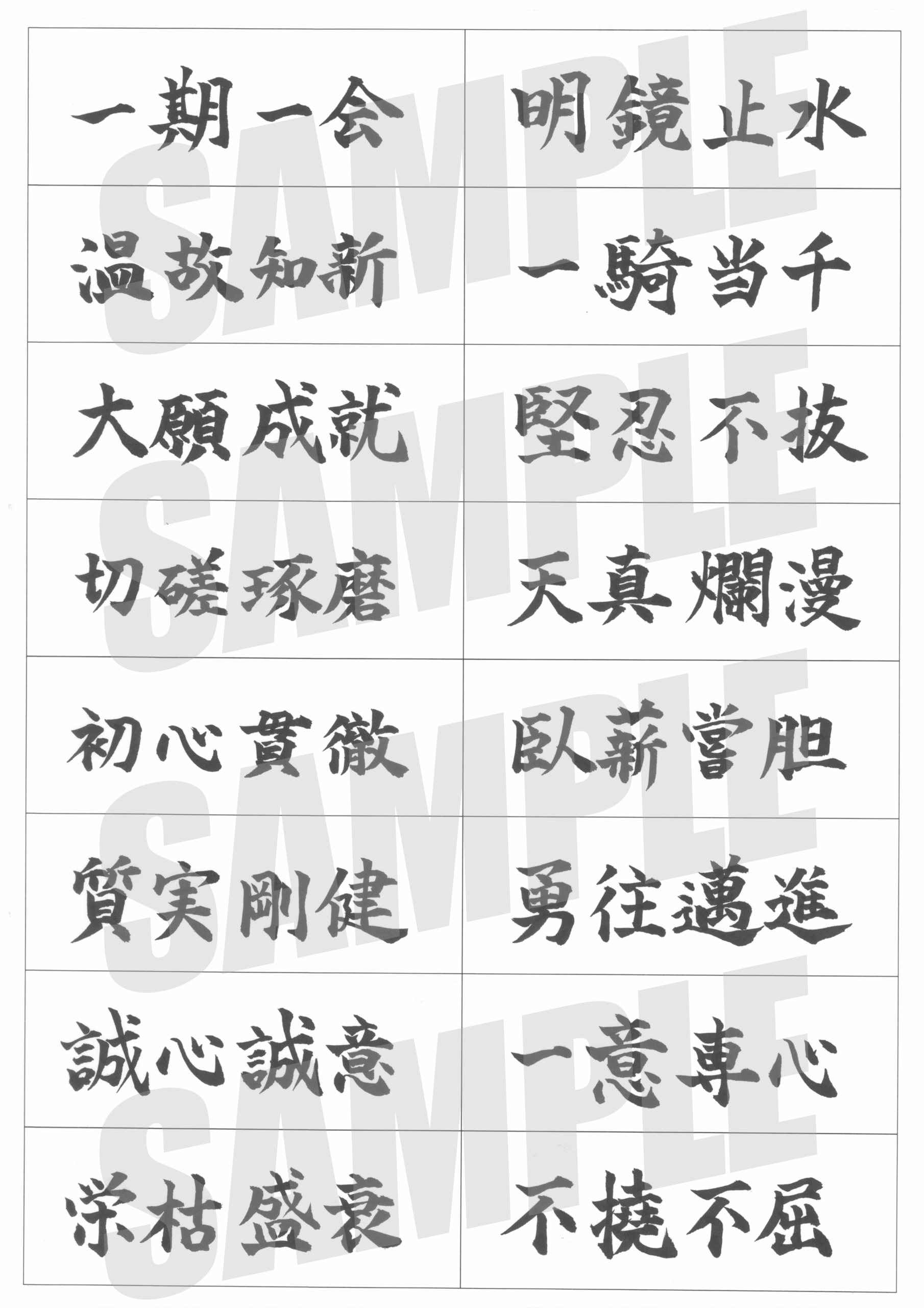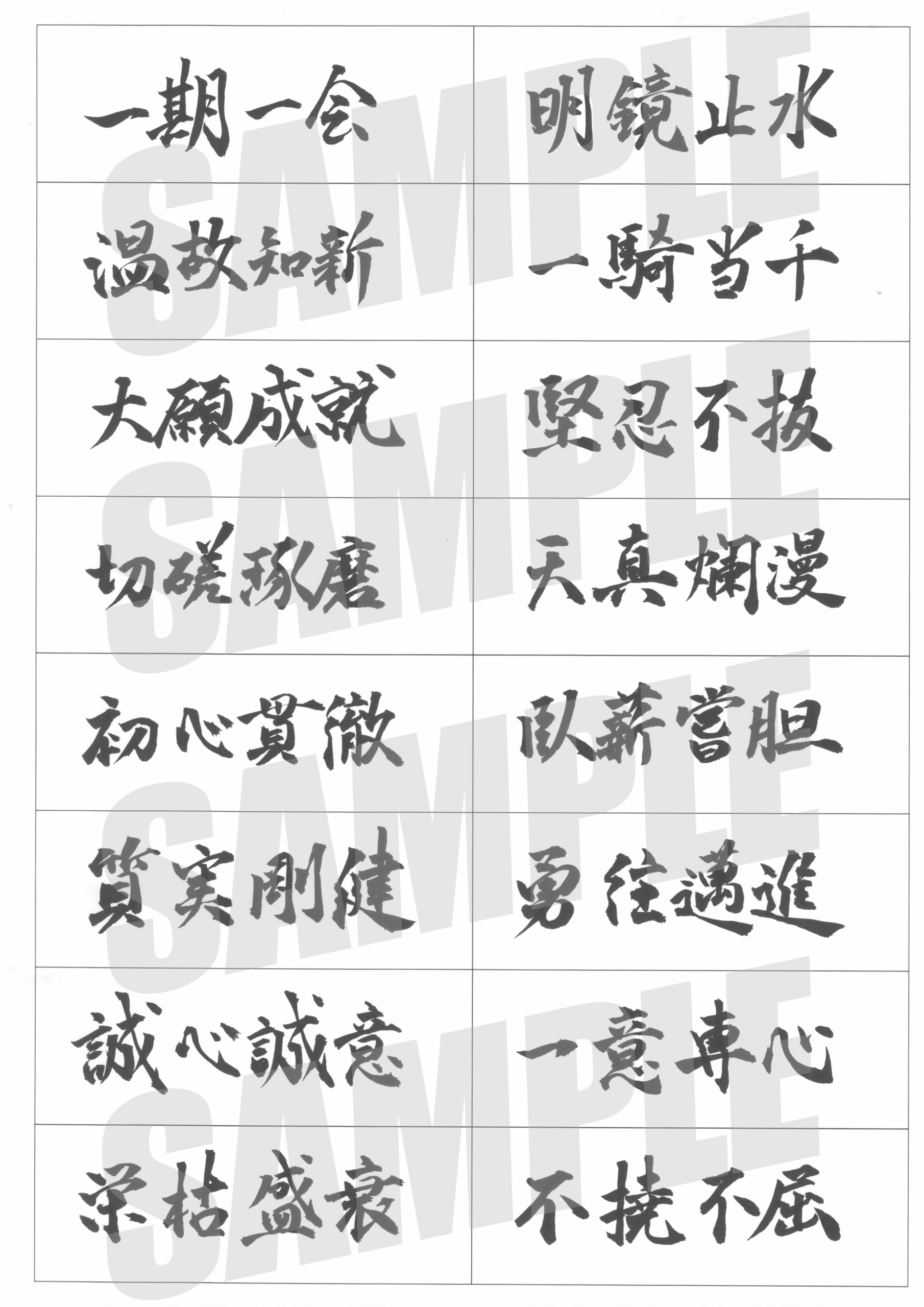 一期一会・切磋琢磨・誠心誠意など、人との出会いや努力の精神を表す熟語を極細筆ペンで楷書体として書いた作品群です。
