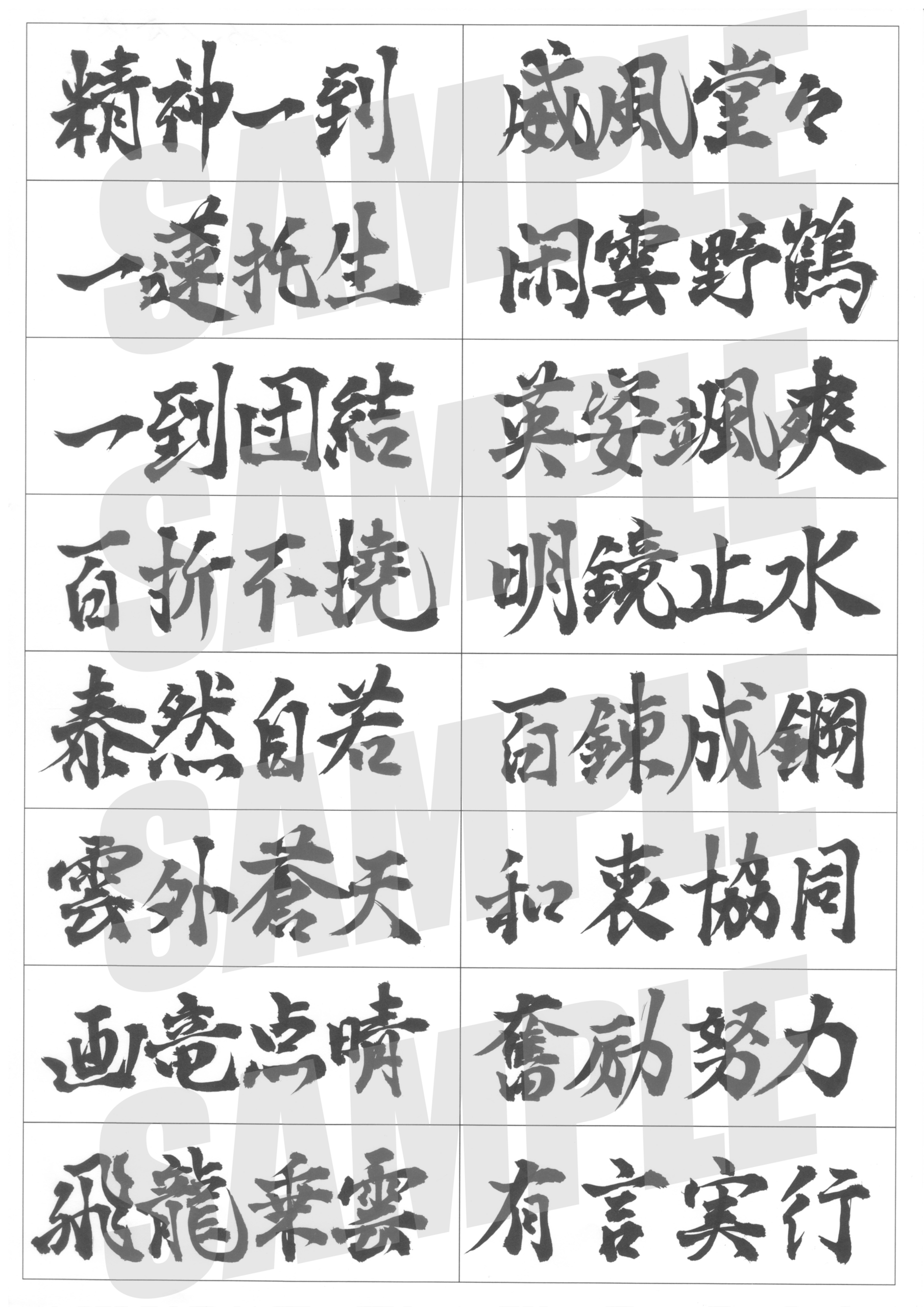 精神一到・威風堂々・明鏡止水など、人との出会いや努力の精神を表す熟語を筆ペンで行書体として書いた作品群です。